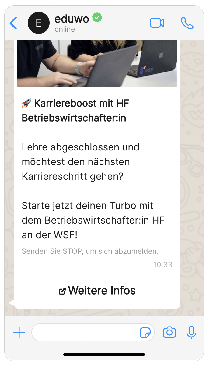 Nutzen Sie den direkten Draht zu Ihren Interessent:innen. Persönlich, schnell und mit höchsten Öffnungsraten. Ob Info, Reminder oder Promotion: Ihre Botschaften kommen garantiert an.
